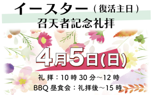 4月5日(日) 礼拝:10時30分〜12時、BBQ昼食会:礼拝後〜15時