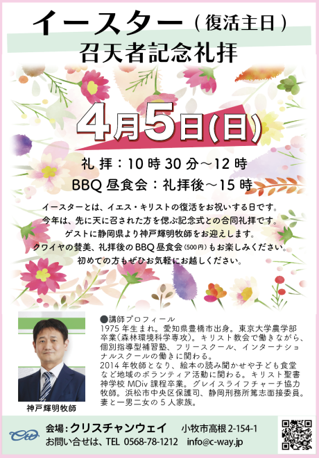 4月5日(日) 礼拝:10時30分〜12時、BBQ昼食会:礼拝後〜15時